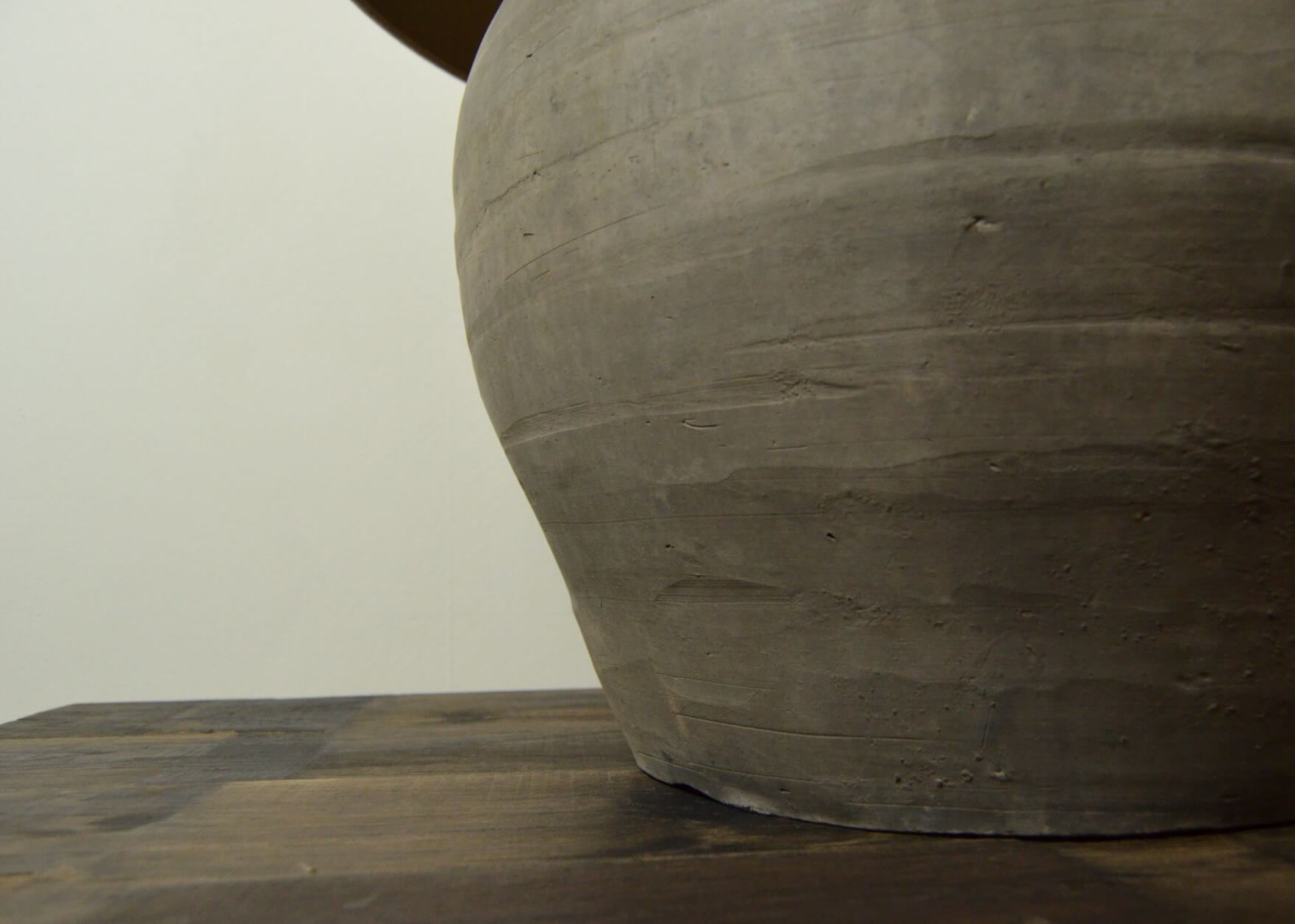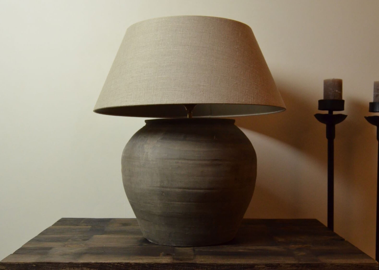 Prachtige grijze kruiklamp van aardewerk met linnen kap in beige kleur.