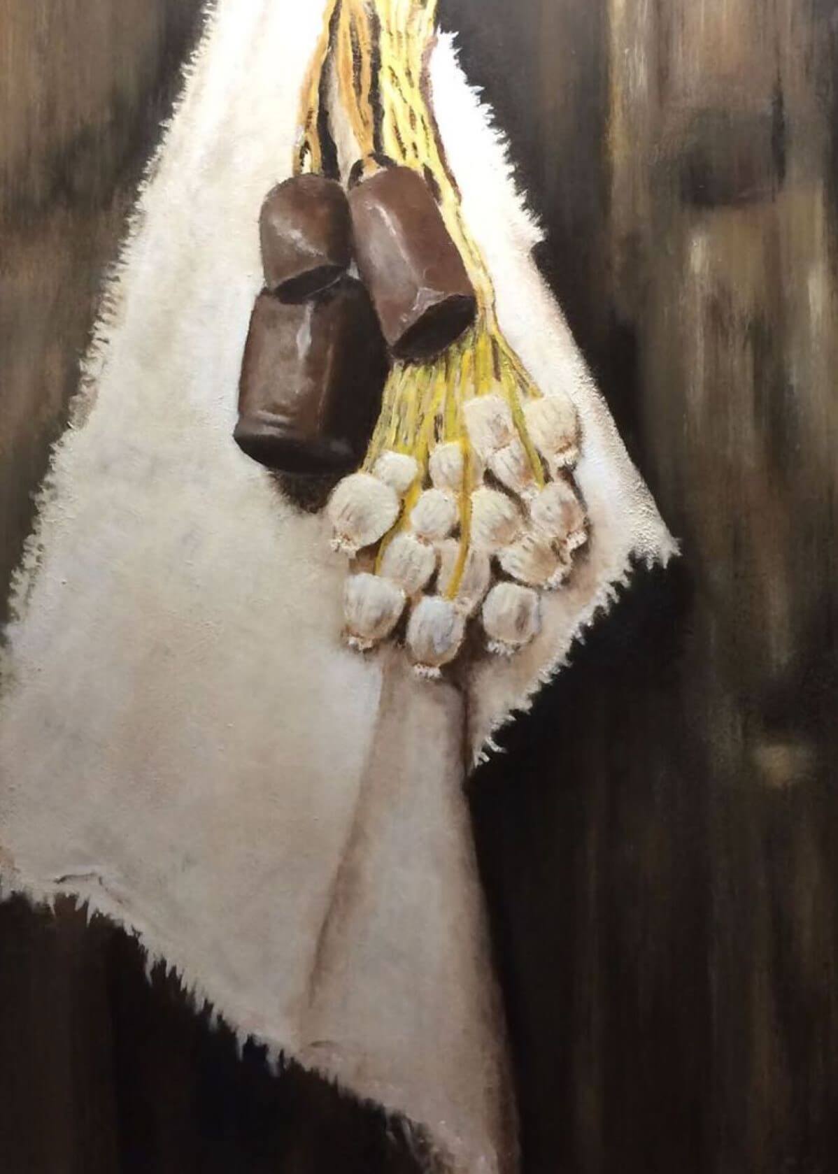 Prachtig schilderij met geitenbellen, een linnen doek en papavers, door G. Piek geschilderd met acrylverf op paneel.