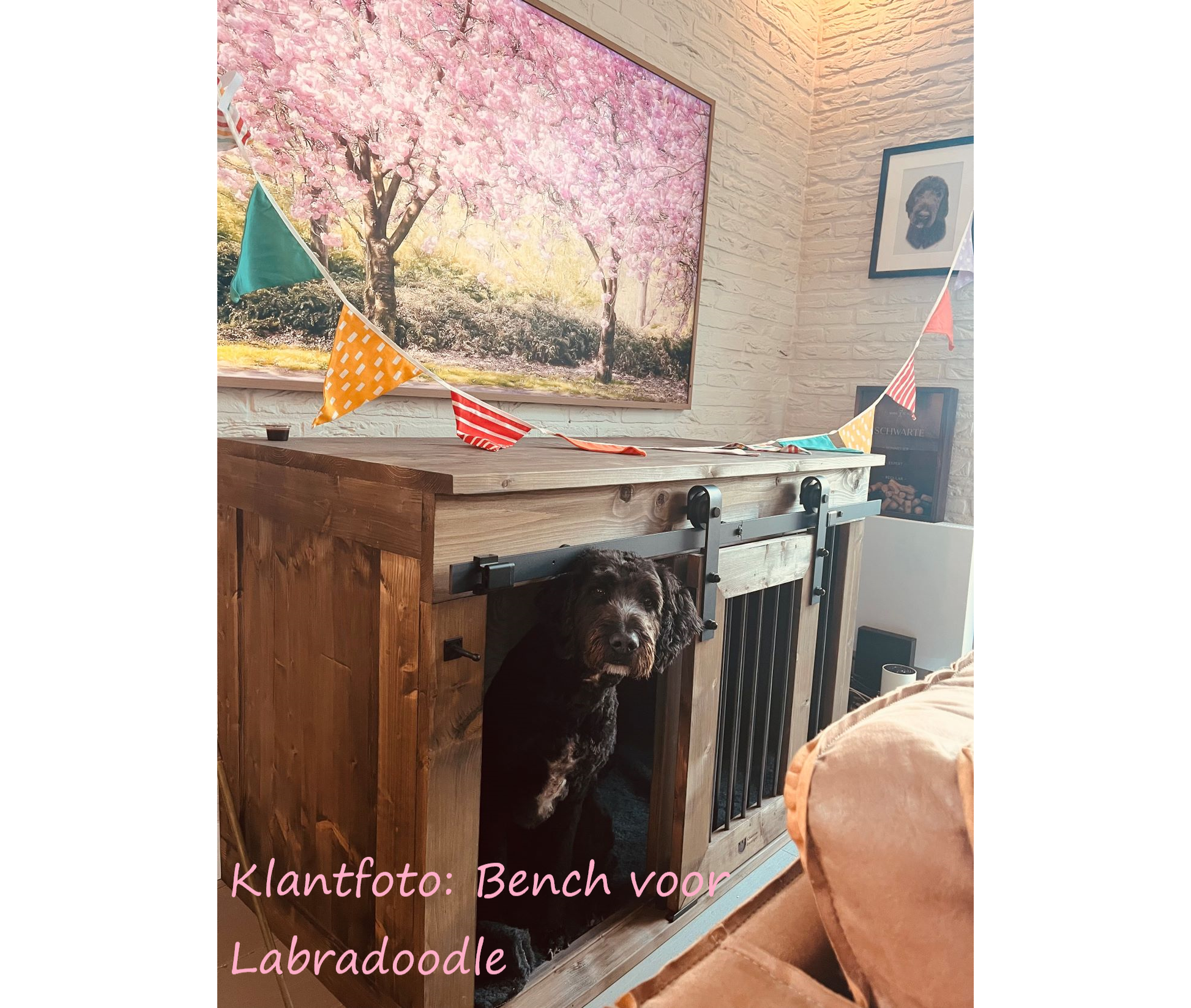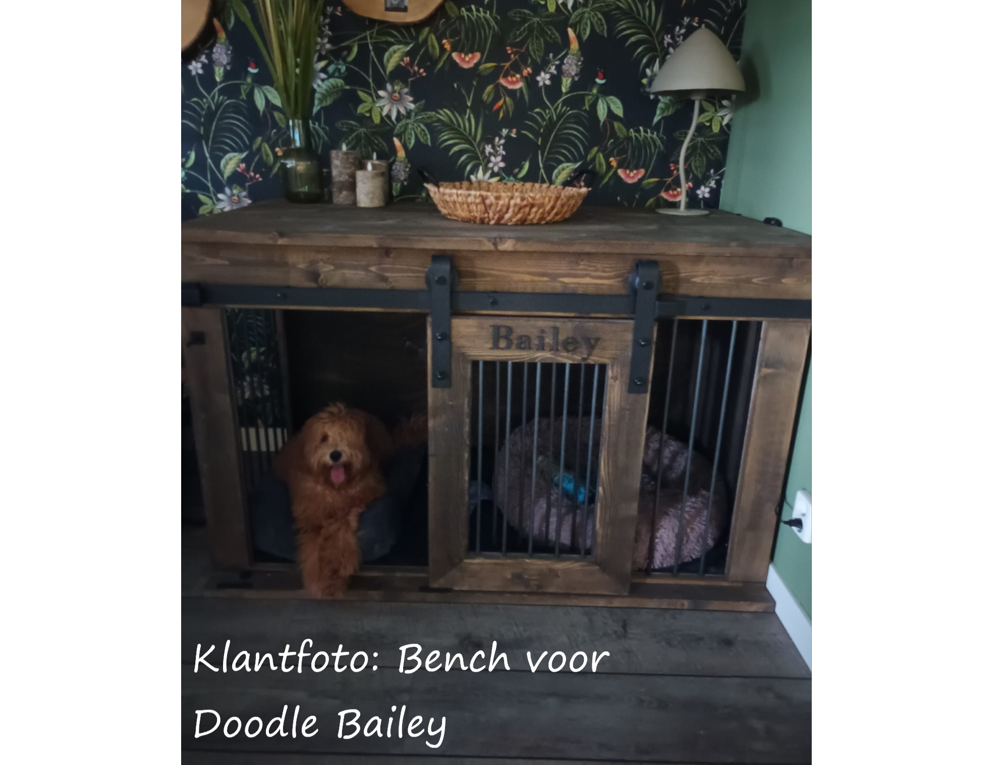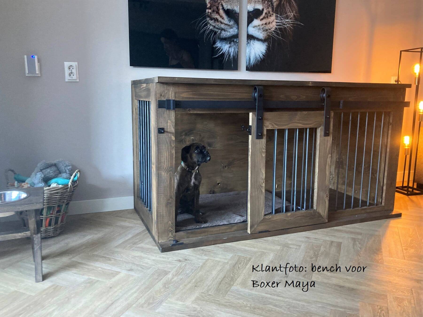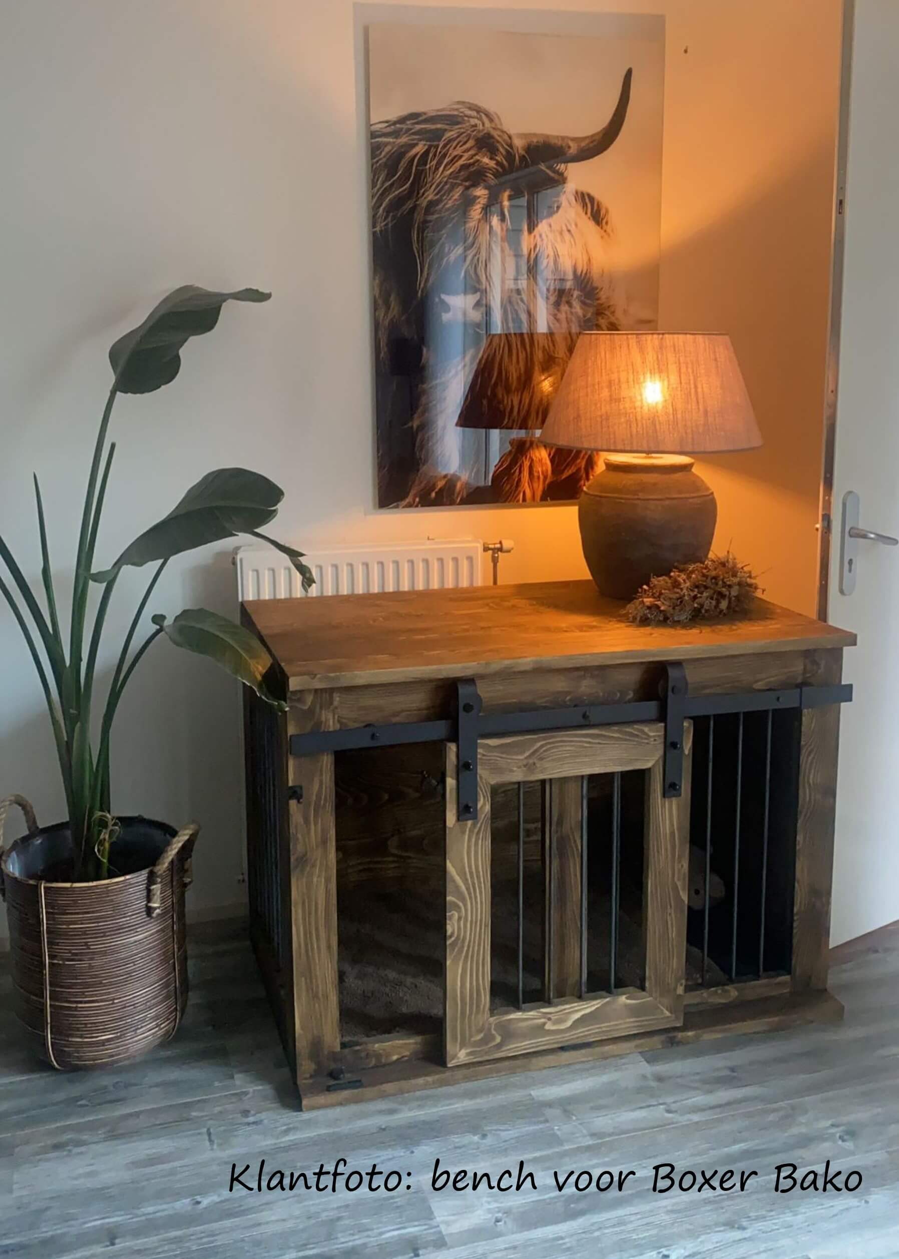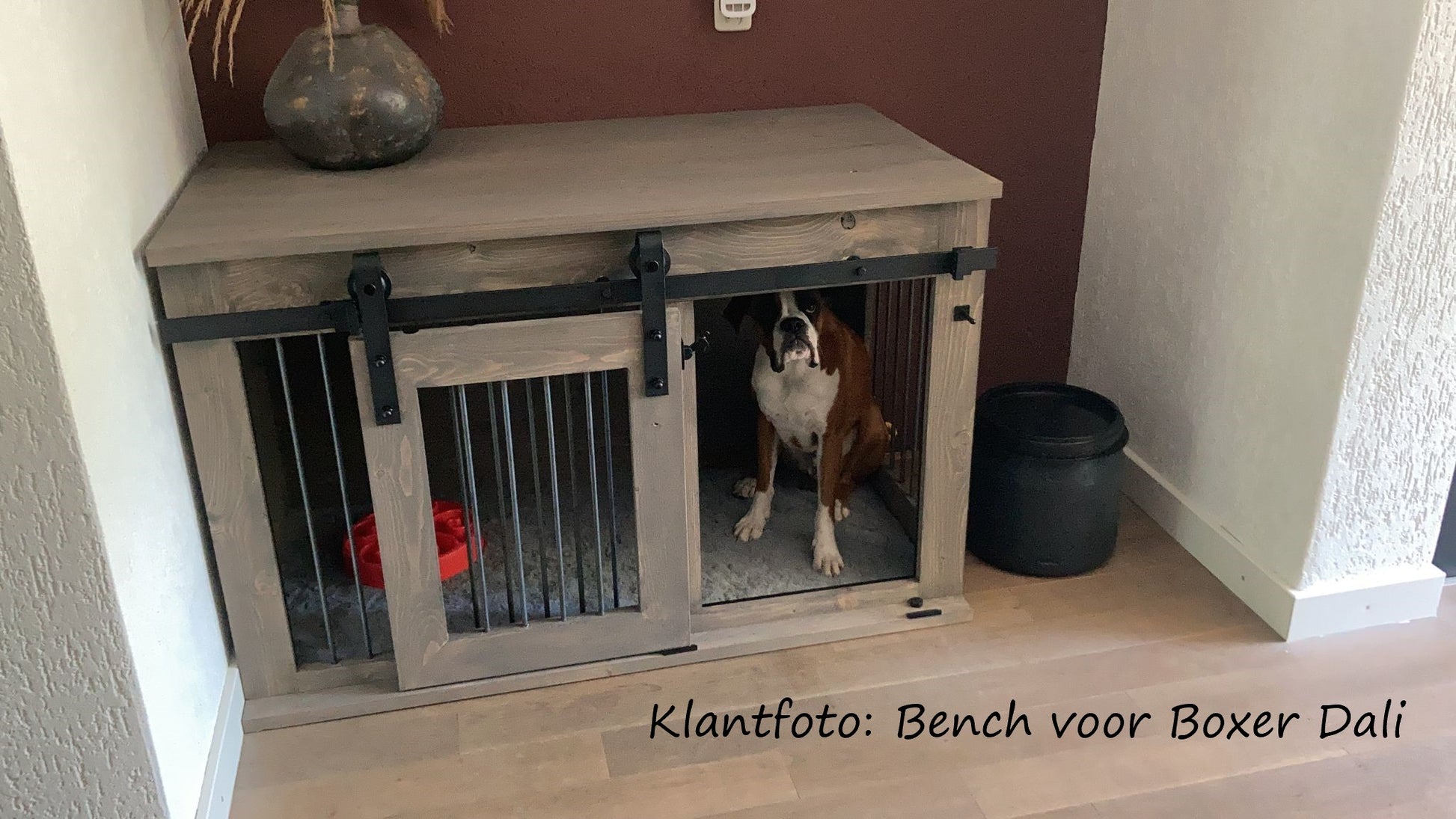 Oorspronkelijk heb ik de bench gebouwd voor mijn Boxer pup en nu maak ik hem ook heel graag voor jouw viervoeter! Mijn hond kon erg snel aan zijn plekje wennen en speelt en slaapt er veel in.