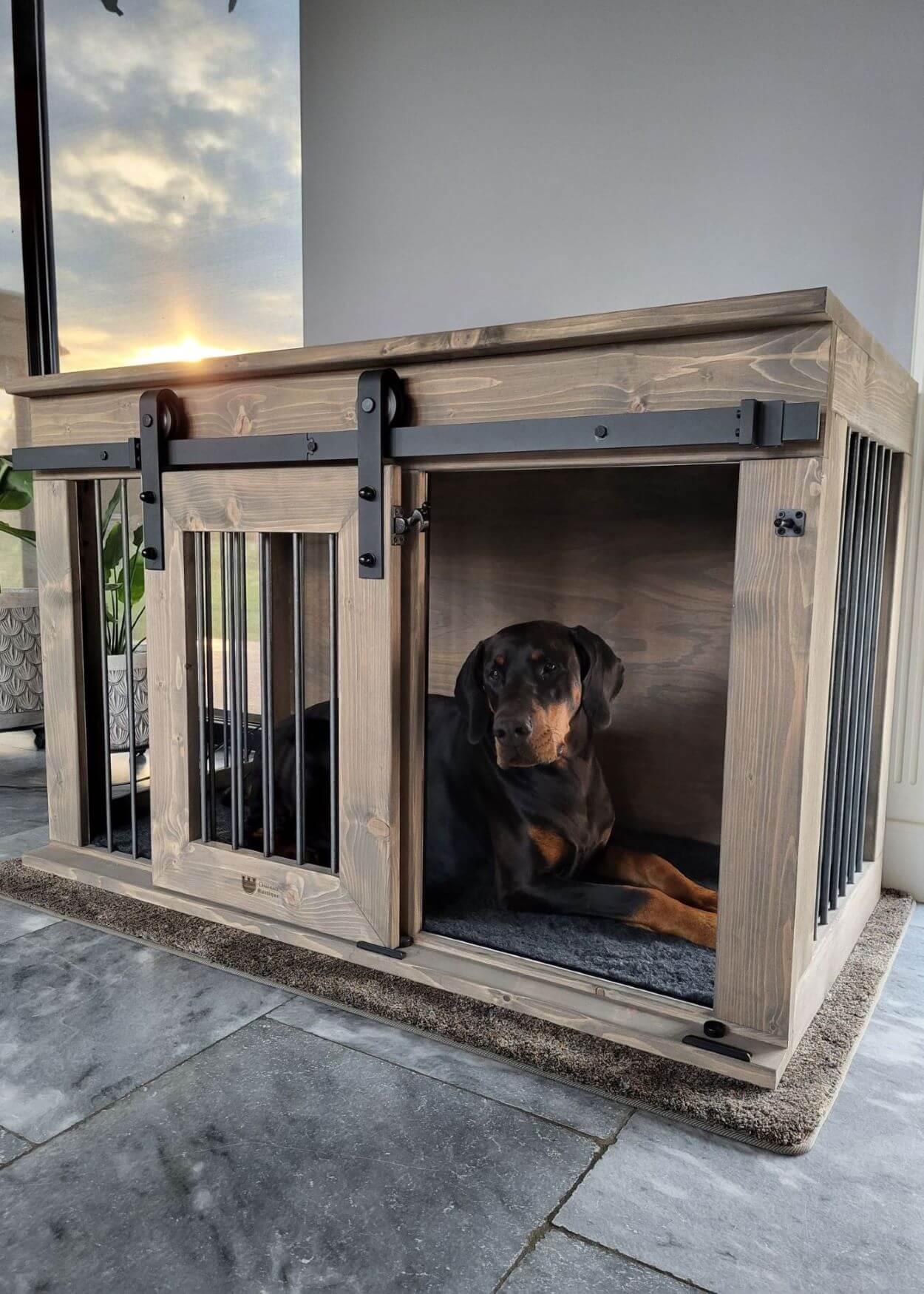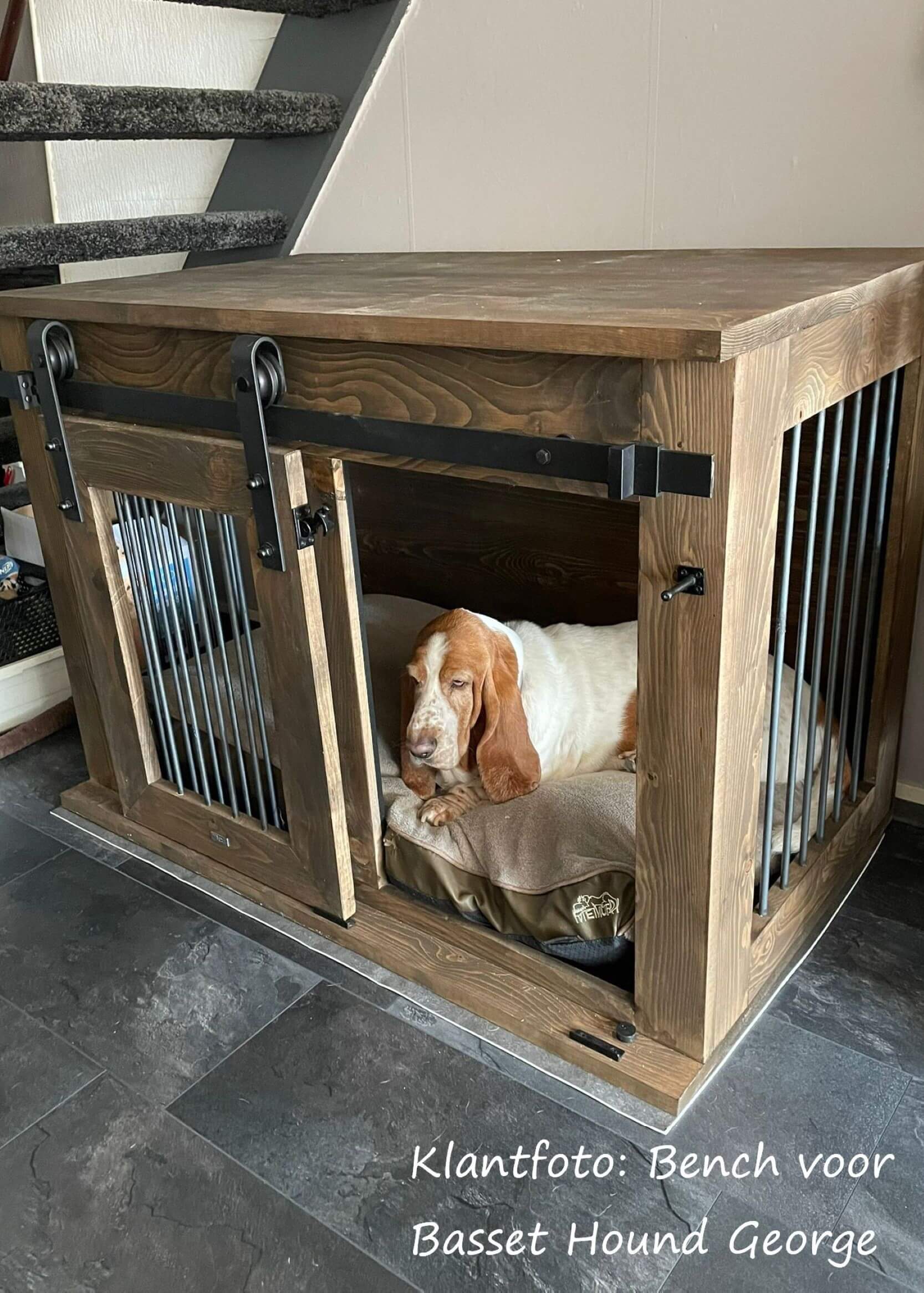 Stoere houten hondenbench, zelf ontworpen en gemaakt in mijn houtshop.